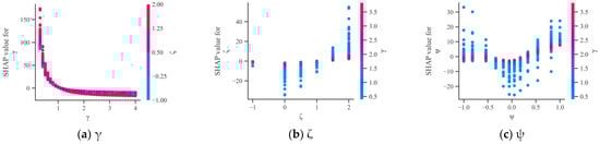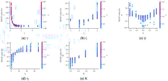 In Figure 18c, the relationship between ψ and the SHAP value is U-shaped. The SHAP value decreased at first and then increased with an increase of ψ. It changed from positive values to negative values when ψ exceeded −0.5, and it had a negative maximum contribution when ψ was 0.0. Moreover, the color of the right Y-axis indicates that the SHAP value corresponding to ψ is low when the aspect ratio γ is high values (red), and has a large positive or negative SHAP value when the aspect ratio γ is low values (blue).