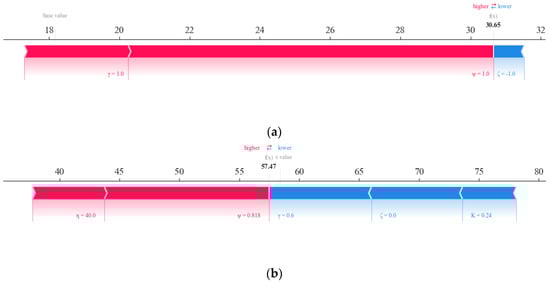 Figure 20 displays the explanation of individual sample prediction. Two samples are used as examples: one from Type-1 and the other from Type-2. Figure 20a shows a sample with the input features γ = 1.0, ζ = −1.0, and ψ = 1.0. Figure 20b shows a sample with the input features γ = 0.6, ζ = 0.0, ψ = 0.818, η = 40.0, and K = 0.24. Features with red arrows will enhance prediction value, whereas blue arrows will decrease prediction value. The base value is the mean prediction value obtained from the ML model on the training set. If there is no information available for the input features, the base value is the output value. For the first sample in Figure 20a, the base value was 18.17 and the predicted buckling coefficient was 30.65. Feature ψ = 1.0 had the most impact on increasing the buckling coefficient with a SHAP value of 10.40, followed by γ = 1.0 with a SHAP value of 2.96. However, ζ = −1.0 had a negative contribution with a SHAP value of −0.88. For this sample, the final prediction result kcr0 was derived from the base value and the sum of the SHAP values of the three input features. For the second sample in Figure 20b, the basic value was 58.40, ψ = 0.818, and η = 40.0 increased by 13.73 and 6.00, respectively. While γ = 0.6, ζ = 0.0, and K = 0.24 decreased −8.56, −7.59, and −4.51, respectively. The predicted buckling coefficient kcr of this sample is 57.47.