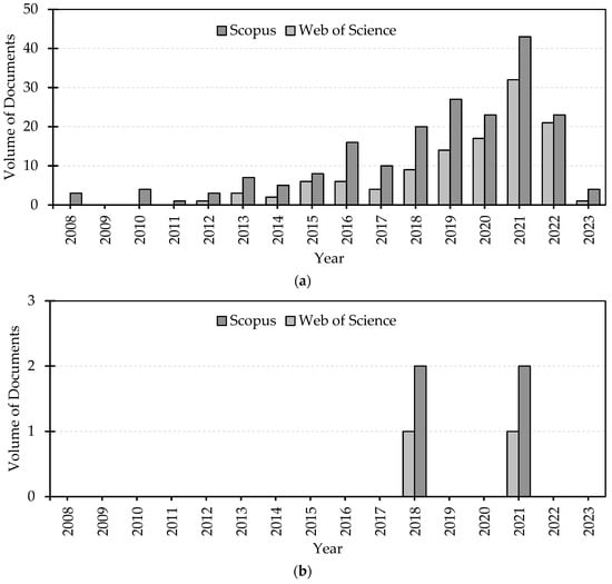 Annual volumes of publications related to the CLT industry by database under observed conditions: (a) general and (b) specific.