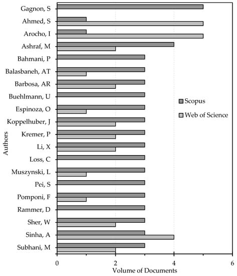 Two hundred authors were confirmed in the Web of Science, and 150 authors were identified in Scopus. Due to these expressive amounts, Figure 2 detailed only those authors with three or more publications in at least one of the analyzed databases.