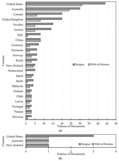 Authors from Latin American nations, such as Brazil and Chile, are also present in publications contained in the general condition, which is more comprehensive (Figure 3a). Due to a higher specificity, the specific condition has only four documents (Figure 3b), which are from Oceanian and American nations.