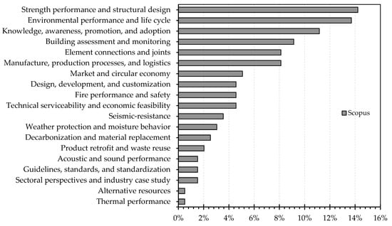 Due to these few documents identified in a specific level and the greater volume of documents indexed by Scopus, the categorization of the main objectives was applied to those publications available in Scopus for the general level (Figure 4). Thereby, it was possible to verify that most of the documents on cross-laminated timber of this more comprehensive type, despite the industrial context, were related to construction uses within a structural, environmental, seismic, design, production, technical, and economic analysis.