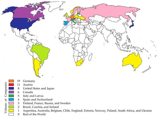 The stage of identification of CLT developers and the respective geographic locations involved a diversified perspective, in which the obtained results demonstrate the effective global presence of this industry. Figure 5 shows the distribution of each CLT developer, according to the origin represented by its headquarters location in early 2023, that is, by its main home country. In practice, this finding becomes extremely important both for the economy of the wood industry and the modernization of construction, insofar as there is a very representative number of active developers aiming to supply the construction activities through this modern engineered wood product.