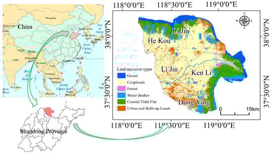 Yellow River Delta (38°15′23″ N–37°52′21″ N, 118°45′57″ E–119°35′46″ E) is located in the core of Blue and Yellow Economic Belt of Shandong Province, mainly including Dongying District, Hekou District, Kenli District, and Lijin County, with an area of about 26,500 square kilometers, which is an important economic development area in China. With an average annual temperature of 12.9 °C and an average annual precipitation of 551.6 mm, the modern Yellow River Delta has a warm temperate continental monsoon climate. It is the largest, newest, and most comprehensive wetland ecological function reserve in China’s warm temperate region. Figure 1 depicts the study area’s scope.