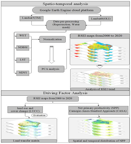 The data time period was chosen from June to August to avoid the impact of seasonal variations and water bodies on the data processing results. The annual permanent water body data were used to flood and remove the study area’s water bodies to completely remove their impact on RSEI calculations. The GEE cloud platform was used for all picture pre-processing operations, including radiometric correction, geometric correction, algorithmic de-clouding, and water body masking. Using the principle component analysis (PCA) method and the Landsat image dataset hosted on the GEE cloud platform, we were able to map the spatio-temporal distribution of the region using the RSEI data of the Yellow River Delta from 2000 to 2020. Based on these data, we analyzed the dynamic evolution of eco-environmental quality in the Yellow River Delta over 20 years and analyzed the variability associated with the eco-environmental quality of the Yellow River Delta using NPP data generated by LUCC and CASA models. The detailed workflow of this study is shown in Figure 2, and the data sources are shown in Table 1.