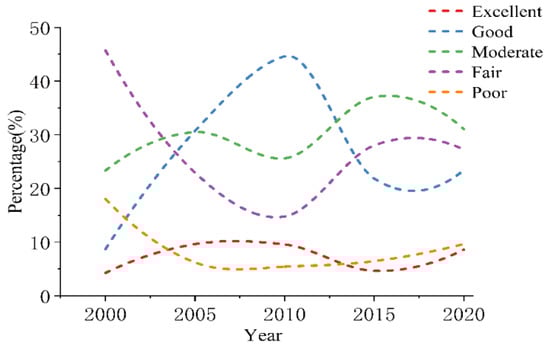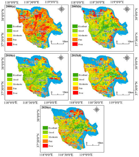 The study area included three districts and one county. In order to better express the spatio-temporal distribution characteristics of eco-environmental quality in the study area, based on the Technical Specification for Assessment of Eco-environmental Status (HJ/T192-2006) issued in 2015, the RSEI values of 2000, 2005, 2010, 2015, and 2020 were divided into five intervals with an interval of 0.2: 0~0.2, 0.2~0.4, 0.4~0.6, 0.6~0.8, and 0.8~1.0, corresponding to five grades of poor, fair, moderate, good, and excellent, respectively. The percentage and distribution of RSEI grades in the Yellow River Delta in each year are shown in Figure 3 and Figure 4.