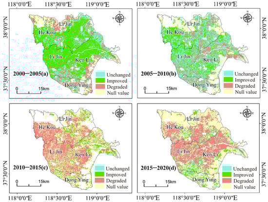 Table 4 and Figure 4 and Figure 5 show that the eco-environmental quality in Dongying District was better in 2000 compared to the other three districts and counties, with a high percentage of excellent and good eco-environmental quality grades, 13.55% and 18.42%, respectively. In 2005, the eco-environmental quality of Dongying District gradually decreased by about 36.13%, while that of the other three districts and counties increased significantly, with the eco-environmental quality of Hekou District increasing by 69.19%, Kenli District increasing by 68.54%, and Lijin County increasing by 92.29%. From 2000 to 2005, the eco-environmental quality of Kenli District, Hekou District, and Lijin County in the Yellow River Delta showed a trend of improvement, while Hekou District and the northern part of Lijin County and Dongying District showed a trend of getting worse and a scattered trend of staying the same. In 2010, the eco-environmental quality of Dongying District continued to decline by about 17.87%, while that of the other three districts gradually became better, with a small-scale improvement in eco-environmental quality. From 2005 to 2010, the eco-environmental quality in the central and southern part of He Kou District, the northern part of Lijin County, and the southeastern part of Kenli District all showed a trend of improvement, while the whole area of Dongying District, the southern part of Lijin County, the northern part of Kenli District, and the southwestern part of He Kou District mainly showed a staggered distribution of getting worse and staying the same. In 2015, the overall eco-environmental quality of the Yellow River Delta deteriorated, with a 7.75% decrease in Dongying District, 59.18% decrease in Hekou District, 37.3% decrease in Kenli District, and 59.4% decrease in Lijin County, and the areas with good eco-environmental quality were mainly concentrated in the northeastern and northern parts of the Yellow River Delta. From 2010 to 2015, the eco-environmental quality in most areas of the four districts and counties showed a deteriorating trend, and only the northern and southern part of Lijin County, the southwestern part of Dongying District, and the eastern part of Kenli District showed a better trend, covering an area of about 749.76 km2. In 2020, the overall eco-environmental quality in the Yellow River Delta showed little change compared with that of 2015, and the distribution of ecological environment quality was similar to that of 2015, with excellent and good grades appearing only in the northeast of Kenli District and the southeast of Hekou District, with an increase of 15.28%. From 2015 to 2020, the central part of the delta showed a worsening trend, with an area of about 2137.76 km2, and only the Dongying District, the southern of the Kenli District, and the central part of the Hekou District showed a tendency of greater ecological quality, with an area of about 491.26 km2.