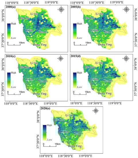 In conclusion, the eco-environmental quality in the Yellow River Delta showed a V-shape change in the past 20 years. From 2000 to 2010, the overall eco-environmental quality gradually became better, among which the eco-environmental quality of Dongying District gradually became worse, and the eco-environmental quality of Hekou District, Kenli District, and Lijin County gradually improved. From 2010 to 2020, the eco-environmental quality gradually deteriorated, with a large area of the eastern, central, and western parts of the delta showing a deterioration of the ecological environment, and the rest of the region showing a staggered deterioration and improvement. From 2010 to 2020, the overall eco-environmental quality of the Yellow River Delta had shown a tendency of improvement. This changing trend was related to the active implementation of policies such as “Regulations of the People’s Republic of China on Nature Reserves, Wetland Protection Measures in Shandong Province, Ecological Protection and High-Quality Development of the Yellow River Delta by the local government in the past 20 years, which had effectively controlled its ecological environment and effectively improved the eco-environmental quality of the Yellow River Delta.
