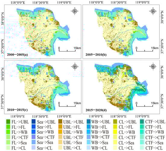 In this manuscript, the annual China Land Cover Dataset (CLCD) was selected for the Yellow River Delta land use data, which mainly contained nine main land types, including arable land, forest land, shrub land, grassland, water surface, glade, bare land, urban construction land, wetland, and so on. Within this dataset, from 2000 to 2020, the land types in the Yellow River Delta mainly included arable land, forest land, urban construction land, coastal mudflats, and water bodies. In order to further understand the 20-year land use change and the range of land change in the Yellow River Delta, a 20-year land transfer matrix was created, as shown in Figure 7, and land-use dynamic degree was calculated according to Formula (12), which was used to represent the quantitative change of LUCC types within a certain period.