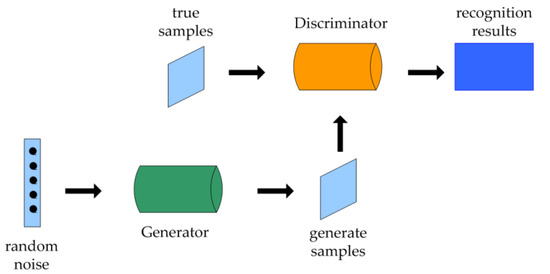 The generative adversarial network can learn the feature distribution of the input data through the game method and then generate the composite sample, whose feature distribution is close to the input data, so that the limited fault data sample set can be expanded. At present, in the field of data augmentation for fault diagnosis, the mainstream solution to the problem of unbalanced data sets is to use the generative adversarial network to expand the data set. The model is divided into two parts: generator G and discriminator D. The purpose of the generator is to generate pseudo-samples as close as possible to the real samples, and the purpose of the discriminator is to distinguish between real samples and pseudo-samples. The two compete, co-evolve, and finally reach Nash equilibrium. The network structure of the GAN is shown in Figure 1.