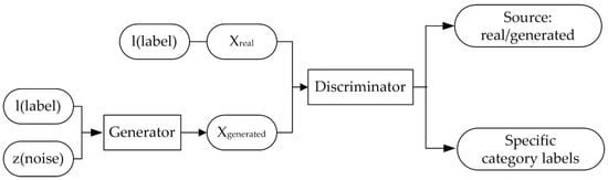 When compared with conventional GAN, ACGAN can generate high-quality data while providing label information. The generator network uses label information l and random noise z as input to generate data samples, , and the discriminator network receives a data sample as input and then outputs the authenticity and label of the sample. Therefore, its objective function is two independent log-likelihoods, corresponding to the true or false and correct label of the data sample, as follows: