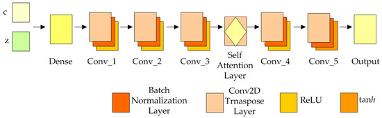 The generator structure is shown in Figure 4. Transposed convolutional layer uses batch normalization and ReLU activation function, and output transposed convolutional layer uses tanh function as activation function. The feature vector z and label c obtained by the PCA dimension reduction of the two-dimensional grayscale image are connected to the input generator, and the dimension is expanded by 3-layer transposed convolution and input to the Self-Attention layer. The feature details are enriched by calculating the self-attention feature map, and then the generated fault grayscale image is outputted after 2-layer transposed convolution.