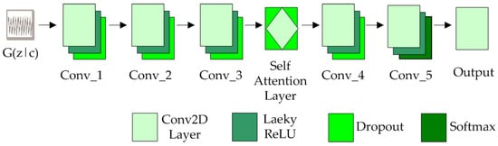 The discriminator model, shown in Figure 5, adopts a structure symmetrical to the generator model. In the output layer, the SoftMax function is used as an activation function to troubleshoot the data. In order to adapt to the gradient penalty term, the discriminator removes spectrum normalization and batch normalization. The LeakyReLU function is used as the activation function in each convolutional layer, and the Dropout layer is added to reduce the calculation parameters of the model and reduce the occurrence of over-fitting.