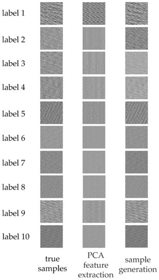 Then, verify that the model can effectively fit the characteristics of fault samples and ensure the diversity of generated samples. After the training of the new model is completed, the data of 10 kinds of label faults of rolling bearings are enhanced to obtain the generated high-quality fault sample set. Figure 8 is the comparison between the 10 rolling bearing fault samples generated by the PCA-ACWGAN-GP model and the real samples. Figure 8 shows that the pseudo samples generated by the PCA-ACWGAN-GP model retain most of the important features of the real samples, making the pseudo samples highly similar to the real samples but not identical.