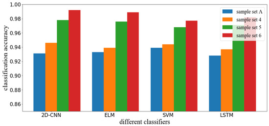 In order to eliminate the influence of the classification performance of the 2D-CNN classifier itself on the results, this paper adds other commonly used classifiers for experiments, including the ELM [30], SVM [31], and LSTM algorithms [32]. The above methods are trained using sample set A and sample set 4, 5, and 6; fault diagnosis is performed on fault sample set B. The accuracy is shown in Figure 9. It can be seen from Table 7 that other classification algorithms are consistent with the performance of 2D-CNN. The fault diagnosis accuracy of the classifier trained by sample set 6 is obviously higher. This result proves that the results of 2D-CNN in this experiment can represent other fault classifiers and can effectively judge the data enhancement performance of the model.