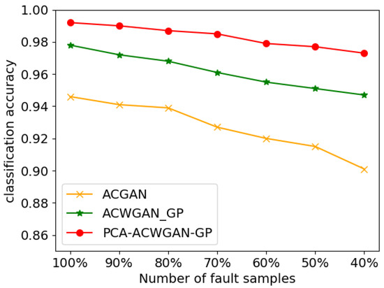 The training sets of different sizes in Table 7 are used in the model training of the ACGAN, ACWGAN-GP, and PCA-ACWGAN-GP in turn. Each retraining model needs to clear all the data to avoid the influence of repeated training samples on the training results. After the three models have converged through enough epochs, the data augmentation for samples under each fault label and the generated sample set is randomly mixed with the training sample set to form a corresponding expanded sample set. In order to avoid the influence of the expanded sample size on the training effect of the classifier, the expanded sample set is uniformly set to 1500 samples for each type of fault. The extended sample sets are used to train 2D-CNN. After training, the fault diagnosis performance of sample set B is tested. The classification accuracy is shown in Figure 10. It can be seen from the figure that the fault diagnosis accuracy of the PCA-ACWGAN-GP extended sample set training classifier is still 97.3% when the minimum sample set is reduced to 40%. With the decrease in the number of training samples, the fault diagnosis accuracy of 2D-CNN trained by the PCA-ACWGAN-GP extended sample set decreases more slowly, and its fault diagnosis accuracy is better than ACGAN. The above conclusions show that PCA-ACWGAN-GP can effectively solve the problem of data quality degradation in the limited small sample scenario and effectively enhance the data of rolling bearing fault samples to improve the accuracy of fault diagnosis.