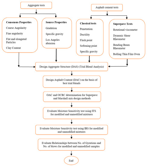 - In total, 64 Superpave Marshall samples were prepared for each source used in the study for the design aggregate structure (DAS), design asphalt content (DAC), optimum asphalt content (OAC), optimum crumb rubber content (OCRC), Marshall stability, indirect tensile strength test (ITS), and index of retained strength test (IRS), as shown in Figure 2.