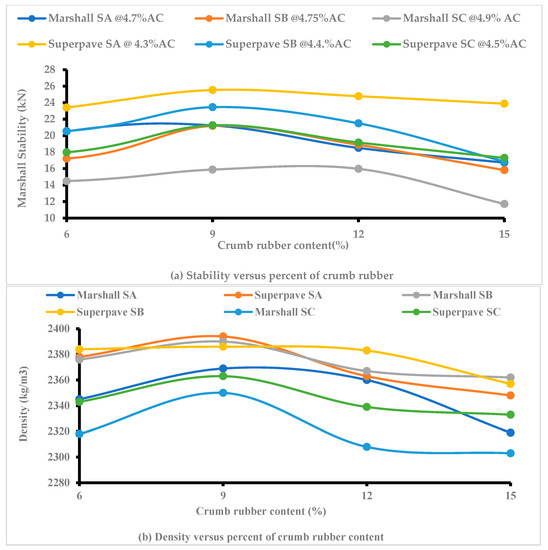 In order to determine the OCRC, four percentages of crumb rubber (CR) were used (6, 9, 12, and 15) based on the previous studies of [56,57] and the 3 percent interval was used to obtain accurate results. Normally, in the wet process, less CR content is used compared to the dry process. These percentages of CR were used for each source using both the Marshall and Superpave mix design methods. Figure 3 illustrates that the stability and density of all the mixes increased steadily at six percent CR until it reached a maximum value at nine percent CR. Then, it gradually decreased. Generally, the Superpave mix design provided the maximum Marshall stability and density in all three sources compared to the Marshall mix design. However, both mix designs provided the maximum Marshall stability at nine percent CR. Accordingly, nine percent CR was selected as the OCRC for both mix design methods. Normally, the optimum CR content is selected on the basis of excellent performance, and usually, ranges vary from one study to another, depending on the parameters that are used. This result has trends that are similar to the results of prior studies [58,59,60].