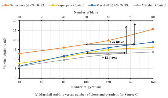 - Source C: In order to achieve the same Marshall stability value as the Superpave unmodified sample, the MIH sample required 68 blows (18 extra blows). In addition, the modified sample at 9 percent OCRC required 72 blows (22 extra blows).