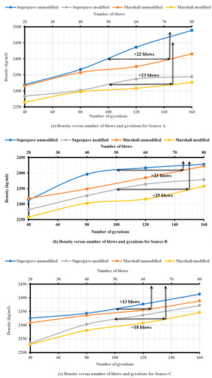 Considering the density determined using the SGC and MIH methods, it can be observed in Figure 5a,b that for the unmodified and modified samples from sources A and B, the Marshall specimens required approximately an average of 73 blows (23 extra blows) in order to obtain the same density as the Superpave specimens at Ndesign. The unmodified and modified specimens from source C required 68 and 63 blows, respectively (18 and 13 extra blows, respectively), as shown in Figure 5c. Accordingly, an average of 71 blows (21 extra blows) was required for all three sources used in this study. The SGC provided higher density and lower air voids than the MIH due to better simulation of field compaction. The results of this study conform with those of previous studies [61,66,67].