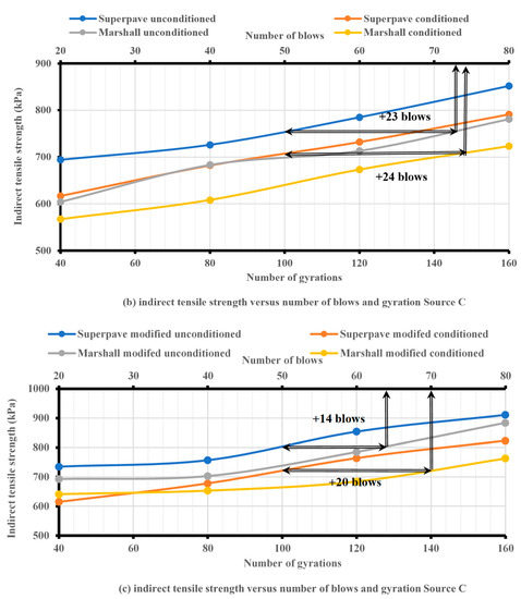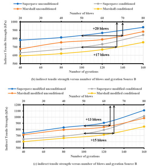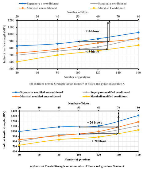 Consequently, the required number of extra blows decreased for the conditioned and unconditioned specimens from sources B and C, as shown in Figure 7b,c and Figure 8b,c. On the other hand, for specimens from source A, the required number of extra blows required to obtain the same tensile strength as with the SGC increased, as shown in Figure 6b,c. Therefore, the required number of extra blows depended on which compaction technique was more influenced by CRM and may also have depended on the percentage of asphalt content, the aggregate gradation, and the source of the material.