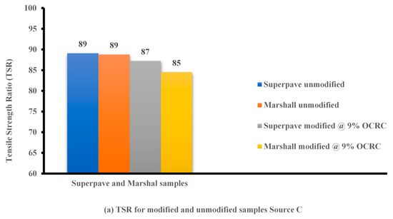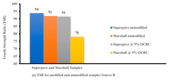 Moisture damage is one of the most significant causes that lead flexible pavement to be distressed after construction while exposing it to heavy rainfall and temperature variations. Figure 6a, Figure 7a and Figure 8a demonstrate that the tensile strength ratios (TSRs) of the samples conformed to the standard specifications of the Superpave, which should be more than 80 percent, except the conditioned Marshall sample modified at 9 percent OCRC from Source B, which failed the TSR. This may have been due to the effect of the compaction method, which did not form a strong skeleton in the asphalt mixture compared to Superpave kneading, but the result was very close to the specification, as shown in Figure 7a.