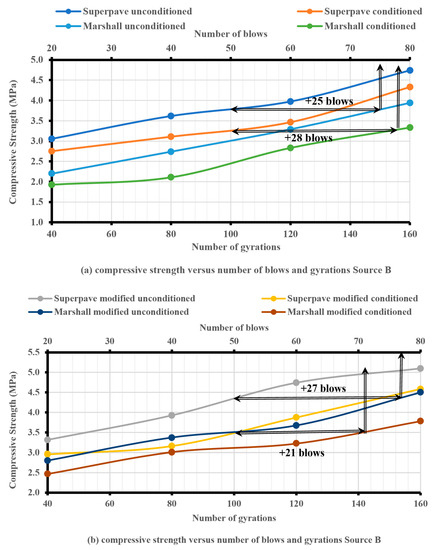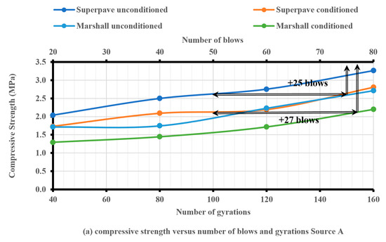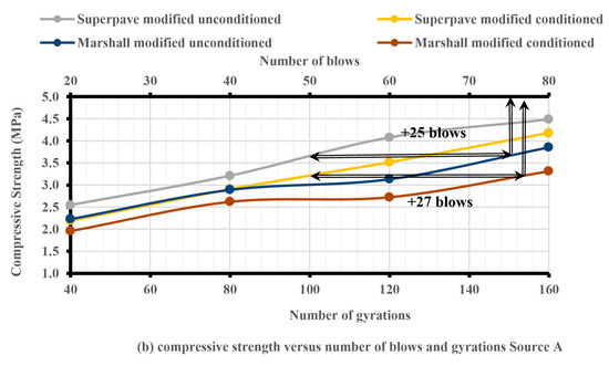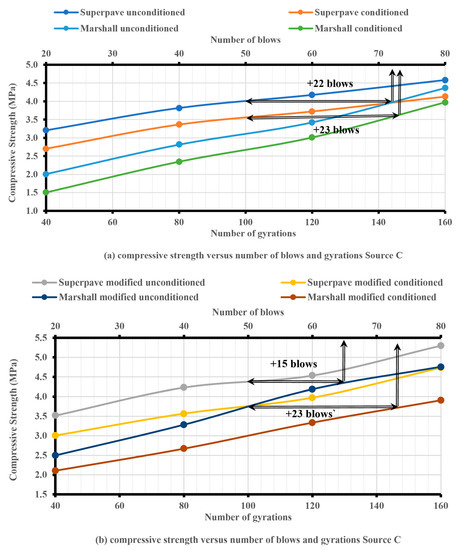 The compressive strength of the Superpave and Marshall samples was increased by increasing the number of blows and gyrations for unmodified, modified, unconditioned, and conditioned samples from all three sources used in this study. However, the Superpave samples had higher compressive strength values than the Marshall samples with an equivalent number of blows, as shown in Figure 9, Figure 10 and Figure 11. The number of extra blows required by the MIH in order to obtain the same compressive strength as with the SGC at Ndesign was approximately the same for sources A and B, and it was around 76 blows (26 extra blows). However, source C required a lower number of extra blows (around 71 blows (21 extra blows)). As a result, an average of 74 blows (24 extra blows) was required by all three sources in order to obtain the same compressive strength as with the SGC at Ndesign, as demonstrated in Figure 9, Figure 10 and Figure 11. The superiority of the Superpave samples over Marshall samples can be attributed to the fact that in SGC, the interaction between aggregate particles created stronger bonds, and the technique of kneading used during compaction improved the compressive strength of the asphalt mixture. The results of this study have a trend similar to the results of previous studies, such as [64,69].