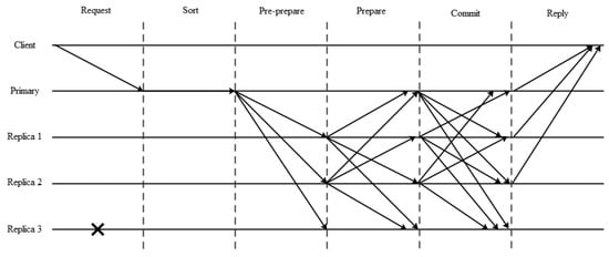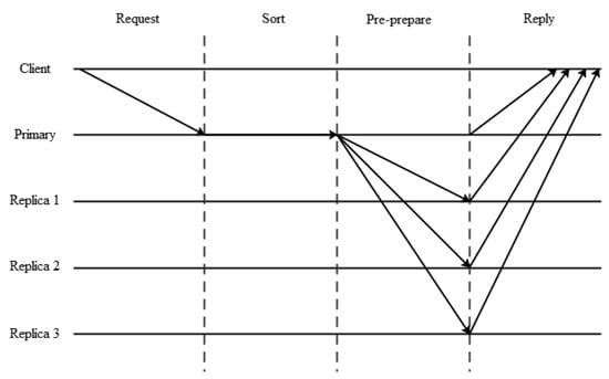 The WtCPBFT consensus process was based on the traditional consensus protocol process, as shown in Figure 3. With the operation of the system, the global reputation value of the nodes becomes increasingly accurate, and the possibility of Byzantine nodes in the primary node is greatly reduced. Therefore, the system adopts the algorithm process of (3a) for a long time to achieve consensus and maintain a virtuous circle, thereby reducing the probability of consensus. This results in response delay, increased system throughput, reduced computing power, and reduced power consumption.