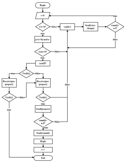 To ensure the activity and security of the PBFT consensus algorithm, when the total number of nodes is , the maximum number of Byzantine nodes that it can tolerate is f. In this algorithm, the consensus protocol ensures that each normal node executes the client’s request messages in the same order; when the primary node has a system error or becomes a Byzantine node, the primary node is replaced by the view replacement protocol, so that the client requests executed by the normal node are not tampered with; the checkpoint protocol is used to clear log records, set watermark values (h and H), and synchronize the node state.