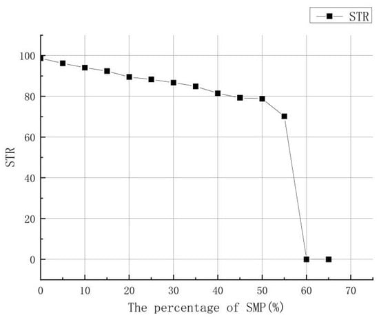 Next, the global credit model was used to solve the probability of malicious nodes in the selected consensus nodes. The successful transaction rate (STR) was introduced into the performance evaluation of the model, that is, the ratio of the number of successful transactions to the total number of transactions in the system. Here, it can be considered that one node selects another node to conduct a transaction. If the transaction node is normal, the transaction is successful; otherwise, the transaction fails. It can be considered that the successful transaction rate also represents the probability that the node selects a normal node. Malicious nodes include simple malicious nodes (SMS), dishonest recommended nodes (SMR), coordinated malicious nodes (CM), and strategic malicious nodes (SMP). Because an SMP node can evaluate according to a specific situation to avoid being identified by the model and provide a lower credit value, its impact on the system is greater than that of other types of malicious nodes. Assuming that all malicious nodes in the system were SMP nodes, the change in the STR with SMP nodes is shown in Figure 5.