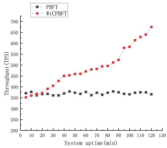 Figure 6 shows that in the early stage of system operation, because the WtCPBFT algorithm increased the Sort process compared with the PBFT algorithm, the throughput was low, approximately 350 TPS. It took a certain time from the start of the operation to the stability of the system, and owing to the existence of the blacklist mechanism, the throughput of the WtCPBFT algorithm system rapidly increased after eliminating malicious nodes, reaching approximately 680 TPS in approximately 120 min. However, because the PBFT algorithm has no blacklist mechanism, the throughput was stable between 350 TPS and 380 TPS.