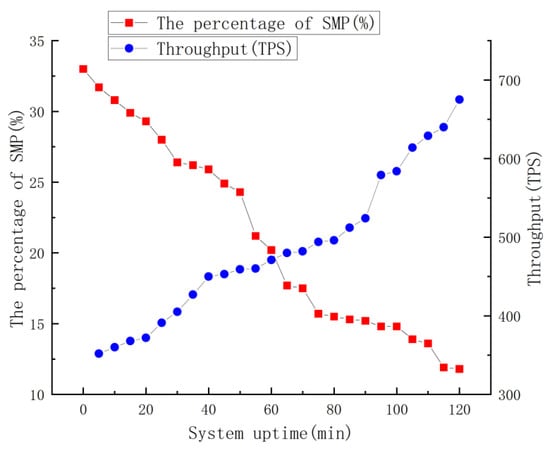 The information in Figure 5 clearly shows that when the proportion of SMP nodes was 40%, the STR was still greater than 80% (approximately 81.3%). With the Byzantine detection mechanism, when the number of malicious nodes in the system appropriately increased, it did not affect the system. However, when the proportion of SMP nodes increased to 55%, the STR sharply dropped. When the proportion of SMP nodes reached approximately 60%, the STR decreased to 0.