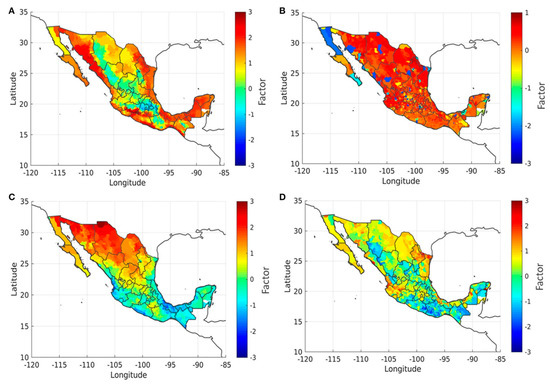 Climatic and socio-economic factors regionalization. (A) Combination of variables related to temperature, (B) combination of population and GDP size, (C) combination of temperature variables, precipitation, and rainfed maize yield, and (D) combination of index of marginalization, people working on the primary sector and per capita GDP [22].