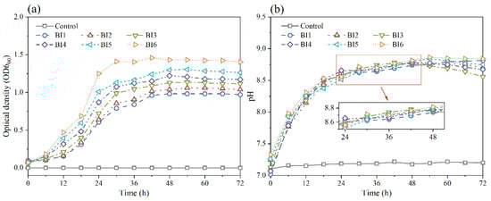 The optical density test procedure was described in detail in Section 2.2., and the OD600 value ranges from 0.8 to 1.6 (up to the standard for bacterial growth [26]) (Figure 1). The pH values of the samples are tested by a pH meter (PHS-3C, China), and the suitable pH for bacterial growth is 7–9 [22]. During incubation, the pH values increase simultaneously with time. The pH values of all sample BIs are 8.5–8.8, which may be related to the bacterial metabolism and the pH of IBA. Additionally, as can be seen from Figure 1b, there is no significant difference in pH values of all the samples. Therefore, it is indicated that the mixing of IBA and biobinder is allowed, that is, the IBA does not inhibit the growth of bacteria.