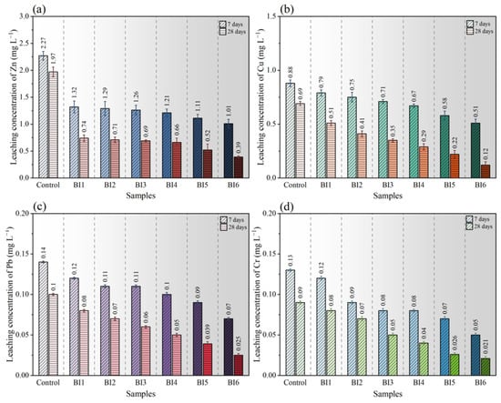 Referring to the results in Table 1, the TCLP test was carried out for the heavy metal elements whose initial concentration exceeded the standard, namely Zn, Cu, Pb, and Cr. The test results are shown in Figure 2. The leaching concentrations of the heavy metals analyzed at 7 days are higher than that at 28 days. Interestingly, at 7 days and 28 days, the difference in the leaching concentrations of the heavy metals in the sample control is small. With the increase in the bacterial concentration, the difference in the leaching concentrations of the heavy metals becomes greater between 7 days and 28 days. This is related to the amount of bioprecipitation and biomass [27], which means that the heavy metals are enveloped in biogels. At 28 days, the immobilization ratios of Zn, Cu, Pb, and Cr in sample BI6 are 80.2%, 82.6%, 75.0%, and 76.6%, respectively. This shows that the concentration of biobinder is positively correlated with the immobilization ratios of heavy metals.
