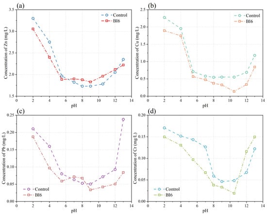 pH dependence results of control and biotreated IBA (BI6). The types of heavy metals correspond to the tested heavy metals in the TCLP test. (a) Zn, (b) Cu, (c) Pb, and (d) Cr.