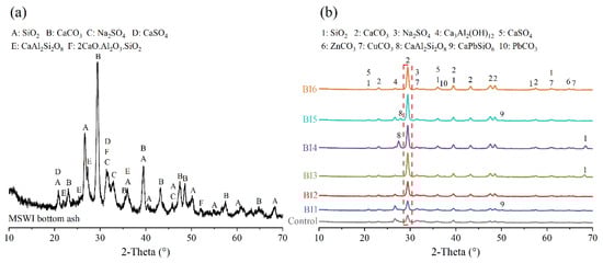 Referring to Figure 4a,b, it is demonstrated that many carbonates are generated in the samples after biotreatment; especially Cu2+, Zn2+, and Pb2+ are precipitated as the precipitations of CuCO3, ZnCO3, and PbCO3, even the co-precipitation of CaPbSiO6 is generated [33]. Note that the peak value of PbCO3 is small because the content of Pb in IBA is not as high as that of Zn and Cu (in Table 1). In conclusion, it is preliminarily speculated that MICP technology changes the chemical morphology of heavy metals in IBA.