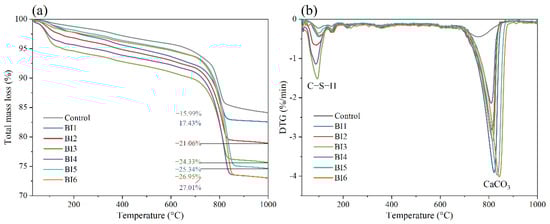 TGA is used to analyze the loss of combustion of the components in the sample, and the results are given in Figure 5a,d. It can be seen from Figure 5a that the total mass loss of the BIs is larger than that of the control. Overall, the total mass loss increases with the increasing concentration of the biosolution. The DTG curve (in Figure 5b) was used to analyze the composition causing mass loss. Figure 5b shows two peaks in the DTG curve: the peak at 30–150 °C indicates calcium silicate hydride (C-S-H), and the peak at 700–850 °C indicates CaCO3. The formation of the C-S-H peak is due to the reaction of CaO in IBA with H2O. According to the intensity of the diffraction peak, the content of C-S-H is small. It is noteworthy that the C-S-H peaks of BI3 and BI4 are larger than those of other samples, indicating that biosolution can improve the activity of CaO in IBA, but the concentration of the biosolution has an optimal range, namely 1 × 103–1 × 104 cells/mL. The high content of C-S-H in BI4 also leads to the largest total mass loss value of BI4 (the value is −27.01% in Figure 5a). From the peak of 700–850 °C, it can be seen that there is a large amount of bioprecipitated CaCO3 in the sample BIs, while a small amount is seen in the sample control. The tendency of the peak value of CaCO3 increases with the increasing concentration of the biosolution because the increase in the concentration of the biosolution improves the mineralization rate and accelerates the mineralization reaction [22]. Interestingly, the peak values of CaCO3 in samples BI4, BI5, and BI6 are the highest and very close, while the peak values of CaCO3 in other samples are quite different. This indicates that when the concentration of the biosolution exceeds 1 × 104 cells/mL, the influence of biosolution concentration on biomineralization begins to decrease, leading to a decrease in the generation of CaCO3.