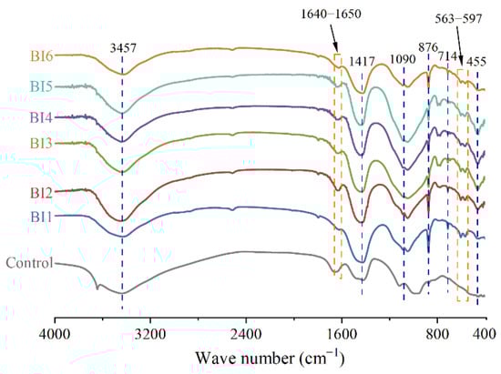 To investigate the effect of bacterial concentration on the chemical bonds of IBA components, the FTIR test results were given in Figure 6. The peaks at 455 cm−1 and 1090 cm−1 are a bending vibration of Si-O (δSi-O) [34] and Si-O stretching vibration [35], respectively. The Si-O-Al deformation vibration [36] is at the peak of 563–597 cm−1. Note that these peaks appear in the sample BIs but not in the sample control. This indicates that the chemical bonds of Si-O and Si-O-Al in the silica change due to the induction of bacteria, and they react with the metal ions to generate CaPbSiO6 and CaAl2Si2O8. This is consistent with the results of XRD (in Figure 4b); the SiO2 in IBA can react with calcium ions and metal ions and then precipitate as the noted compound salt.