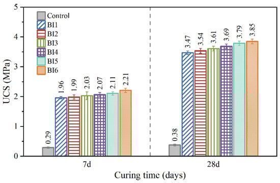 As can be seen from Figure 7, the strength of samples cured for 28 days is 1–2 MPa higher than that of the samples cured for 7 days, except for the sample control. The bacteria in the sample control have no activity and cannot form a cementing agent, and the cementing ability of the biosolution itself is very weak, thus its strength values are very low, and they are all less than 0.4 MPa. At 7 days, the strength value of sample BIs (from BI1 to BI6) increases from 1.96 MPa to 2.21 MPa, while at 28 days, it increases from 3.47 MPa to 3.85 MPa. This shows that the increase in the bacterial concentration and curing time can improve the strength of sample BIs, but the rise is not high. As mentioned in the relevant literature [22], the structure of CaCO3 generated by MICP is compact. However, due to the smooth surface of calcite, the strength value of biotreated samples is generally 2–10 MPa. But this strength value meets the strength standard of architectural coating and backfills. Additionally, the growth peak is observed from 3 to 10 days after inoculation, during which the biomass is the largest. The biomineralization is improved at this time, resulting in the strength of sample BIs at 28 days being 50–70% higher than that at 7 days. This has been confirmed in the literature [43].