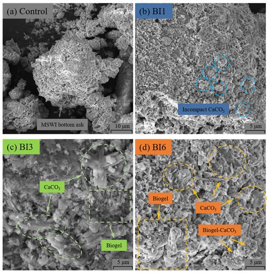 The effect of the bacterial concentration on IBA was further analyzed by microscopic morphology. The SEM images are shown in Figure 8. It can be seen from Figure 8 that the microscopic morphologies of the samples with different bacterial concentrations are significantly different. In Figure 8a, there is a small amount of flocculation (composition of the biosolution after drying) on the surface of the IBA particles, which is not generated by MICP because the added bacteria in sample control are inactivated. It is reported by Ramachandran et al. [44] that the inactivated bacterial solution can still form a gel, but its cementing property is very weak. It can be seen from sample BI1 (in Figure 8b) that there are many incompact CaCO3 precipitates on the surface of IBA particles, and these precipitates have small shapes and even incomplete structures. The bacterial concentration of sample BI3 (in Figure 8c) is 105 cells/mL, thus the generated CaCO3 is the whole prismatic and widely distributed. Meanwhile, many biogels are attached to the surface of IBA, which are not observed in the samples with low bacterial concentrations, such as the control and BI1. Additionally, referring to sample BI6 (in Figure 8d), it is observed that there is a large number of bioprecipitates in the image, and the pores between these precipitates are filled with the biogel, which improves the compactness of the sample.