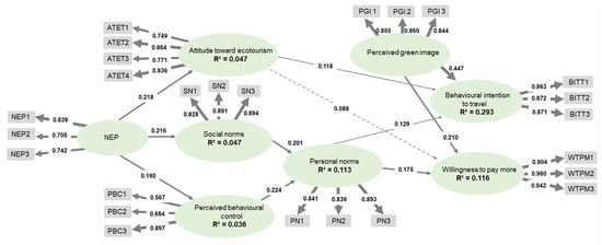 The model was evaluated by computing R2 (the coefficient of determination) and Q2 (cross-validated redundancy measurement). The obtained R2 values for willingness to pay more and behavioural intention to travel were 0.116 and 0.293, respectively. Although these values were relatively low, they are deemed satisfactory in certain cases [93]. The Q2 values ranged from 0.110 to 0.209 and were positive but relatively low. The SRMR obtained was 0.059, which is considered good if the value is below 0.08 [94].