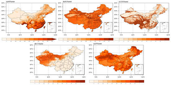 The RUSLE factor estimation of the study area: (a) the rainfall erosivity (units: MJ·mm·hm−2·h−1·a−1); (b) the soil erodibility factor (units: t·hm2·h·MJ−1·hm−2·mm−1); (c) the slope length–steepness factor; (d) the cover management factor; and (e) the conservation support practice factor.
