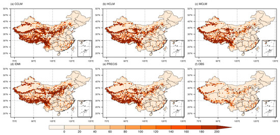 Soil erosion spatial patterns over China from 1986 to 2005, as determined by (a) CCLM, (b) HCLM, (c) MCLM, (d) IDMI, (e) PRECIS, and (f) observation mean (units: t·km−2·a−1).