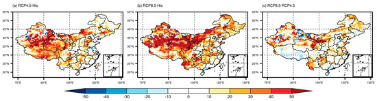 In Figure 5, there is a distinct difference between climate change and land-use change impacts on soil erosion. In the research area, the contribution rates of land-use changes and climate change to soil erosion range from −6.96% to −4.68%, and 59.99% to 78.21%, respectively. In addition, with the increase in radiation force, the contribution rate of climate change increases, while the contribution rate of land use change decreases. This shows that climate change will be the dominant driving factor in soil erosion change in China in the future. The increase in rainfall caused by climate warming will aggravate soil erosion. Land-use changes caused by human activities, on the contrary, mitigate soil erosion to some extent, especially in rapidly developing South China. It is believed that the conversion of the land area into farmland, pasture, and urban land will alleviate soil erosion in the future mainly due to the active transformation of land use by human beings. It is incontrovertible that soil and water conservation measures considerably contribute to the mitigation of soil erosion. Therefore, protective measures should be taken to keep the future soil erosion rate at the current level or even below it within an ideal range.