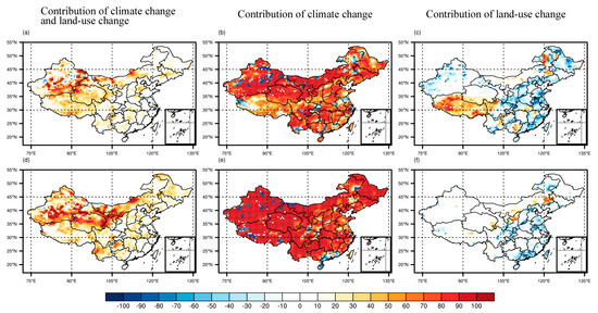 The contribution of climate change and land-use change to soil erosion under two RCPs relative to the historical period. (a–c) RCP4.5 relative to the historical period; (d–f) RCP8.5 relative to the historical period.