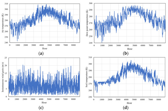 Hourly time-series data freely downloaded from the website of ERA5 [32] for (a) air temperature, (b) dew point temperature, (c) instantaneous wind gusts, and (d) soil temperature during 2021.
