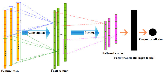 In the artificial intelligence (AI) literature, deep learning (DL) is known as a subset of machine learning and includes various ANNs with at least two hidden layers. It has been addressed in papers that further deepening an ANN via adding hidden layers does not necessarily lead to acceptable results, and what is more important is the proper architecture design for the layers besides using an appropriate optimization algorithm to train the network and a suitable activation function to control the non-linearity of individual neurons in the layers [23,34]. A proper architecture design can avoid data overfitting and vanishing gradients, both of which occasionally occur in the backpropagation algorithm in the network training process. It can also avoid additional computational loads [35]. CNN is a well-known DL model. A one-dimensional (1D) CNN, which can extract suitable features from a raw input time-series dataset and perform regression prediction using the extracted features, consists of two units. The first unit includes input, convolutional, pooling, and output layers. The input layer receives the raw input data that have already been transformed into a suitable tensor form and passes these to the first convolutional layer without performing any operations on them. An appropriate number of equally sized kernels are slid along the input tensor with a convenient equal stride to extract the first feature map from the first convolutional layer. During this sliding, the kernels, which are a vector matrix of weights , are convolutionally multiplied in a limited part of the input tensor , after which the products are summed, and finally, a bias is added to it [36]: