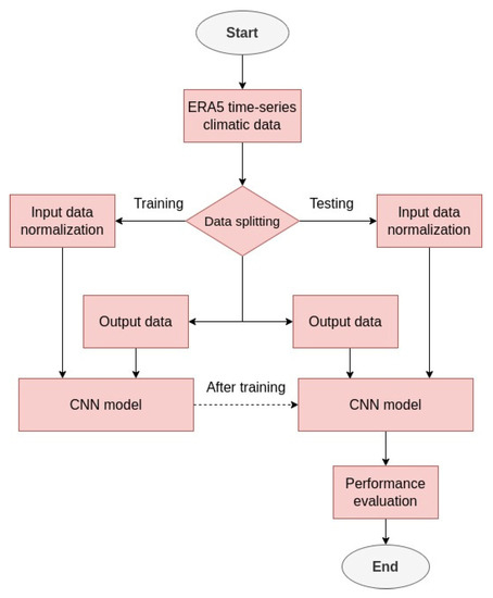 Before designing an appropriate architecture for a supervised machine learning model to cost-effectively and efficiently perform regression prediction in scientific or engineering applications while providing accurate and reliable results, allocating acceptable amounts of time-series input and output data is necessary to train and validate the model and test its performance. This allocation must be carried out such that the time-series format of the input and output data is preserved. In the present study, 70% of the input data, including the eight hourly climatic features introduced in Section 2.1, and the output data encompassing the hourly soil temperature were used to train and validate the CNN model, while the remaining 30% were set aside to test its performance in predicting soil temperature. To reduce the sensitivity of the model to the scale of the climatic features in the input data and thereby allow the model to embark on its iterative training with better learnable parameters, leading to more accurate results and faster convergence, the input training and testing data were normalized by the mean and standard statistical deviation of each independent feature. It is essential to meticulously monitor the model during its training and testing phases by calculating the evaluation metrics introduced in Section 2.3 to ensure that the results are acceptable, and that overfitting does not occur. Figure 4 illustrates the flowchart of the methodology used in this study.
