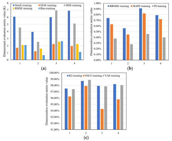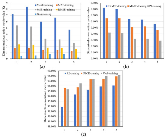 Evaluation metrics calculated for the three-layer 1D CNN model in its training phase, (a) MaxE, MAE, MSE, RMSE, and bias, (b) RRMSE, MAPE, and PI, (c) R2, NSCE, and VAF.
